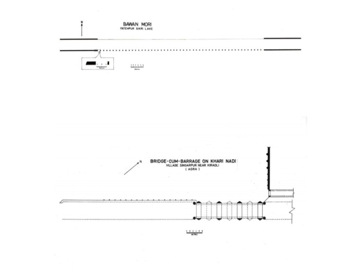 To the north-east of it is constructed the more heavily built barrage now popularly known as the Bawan Mori, which as the name suggests once comprised fifty two sluices. This earthen barrage forms the limit of the lake towards the old township of Nagar. The excess water released from these barrages flowed into a rivulet which then passed on towards the east, crossing the Agra-Sikri road near the town of Kirauli.
