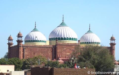 The first and the last are very ornate structures: the Moti Masjid is a marble structure, while the Lahore mosque is a red sand stone structure with insertions of white marble. The Mathura Mosque is more austere and resembles the mosques built by royal ladies of Shahjahan’s reign.