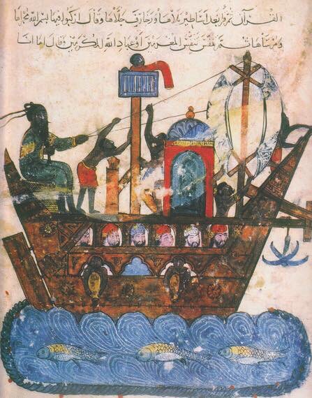 A ship manned by Indian sailors, Maqāmāt of al-Hariri, Baghdad (?), 1237, Bibliothèque Nationale de France, Ms. Arabe 5847, fol. 199 v