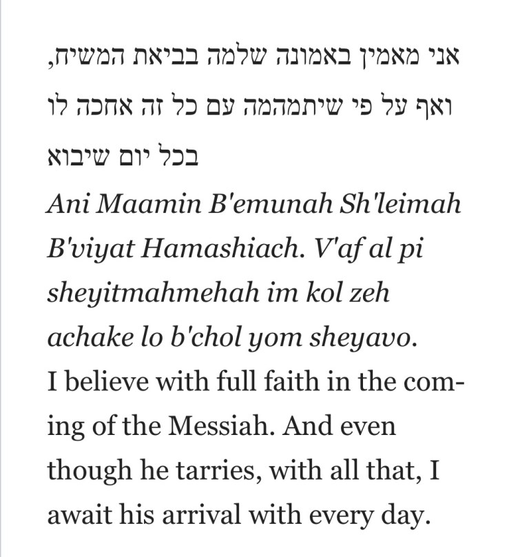 Orthodox Jews strictly believe in a Messiah, life after death, and restoration of the promised land. The text is as follows: