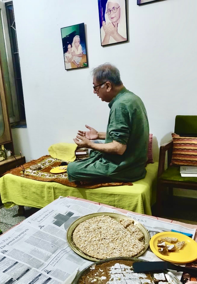 After the nazrs, fātiha would commence. Here it was the reverse order of our genealogy would follow, starting with the fatiha of Dādā Abba, my grandfather. My father would keep out calling name after name: “so and so son of so and so aur unki zauja (wife)”! What intrigued me were two things, first the changing surnames of the ancestors over generations: Ali ibn Ali, Hasan ibn Hasan, Uddin ibn Uddin etc! Second was that zauja was always singular, except in the case of my grandmothers! By the time our genealogy and that of my mother’s side was over, all of us would be extremely tired, eyeing the tempting halwa and waiting for the chance to go out and explode the patākhās! But then the ritual of fātiha was unending!