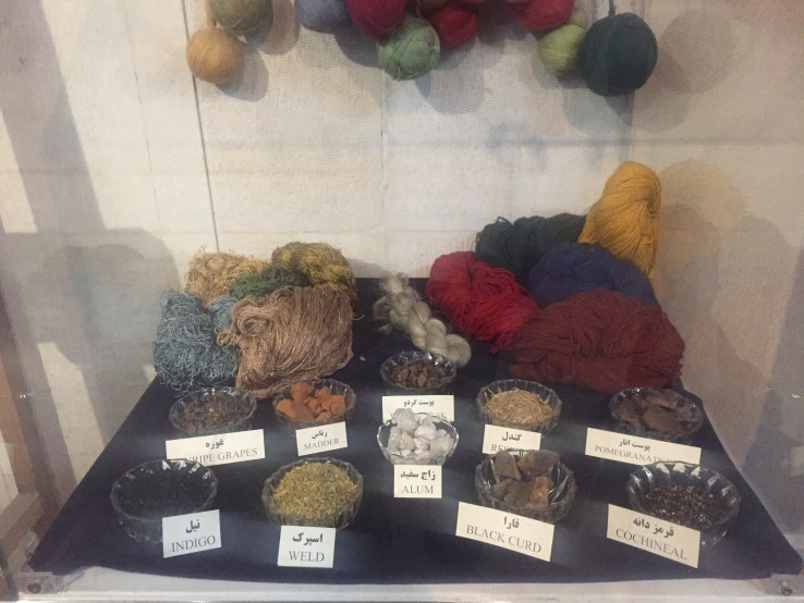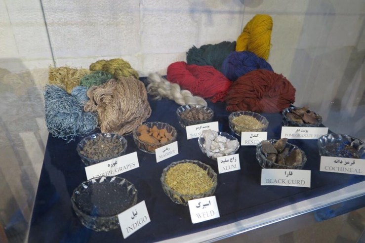 At the entrance to the main hall of the first floor, there is a comprehensive map of the most well-known carpet making centres of Iran, a showcase of various weaving tools, a showcase of some dying natural material as well as dyed threads and a vertical carpet-weaving loom. From time to time, someone sits at the loom and visitors can see how a carpet is woven.