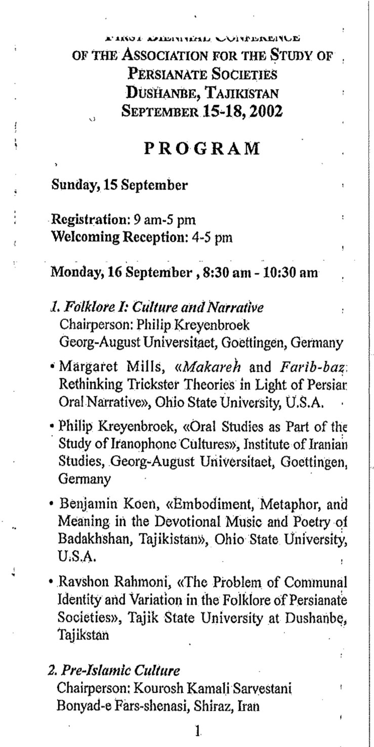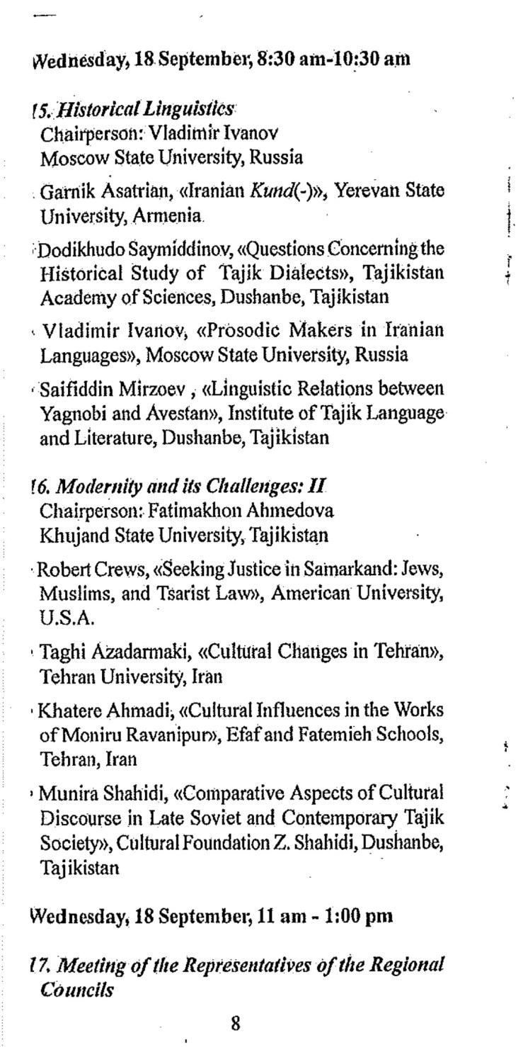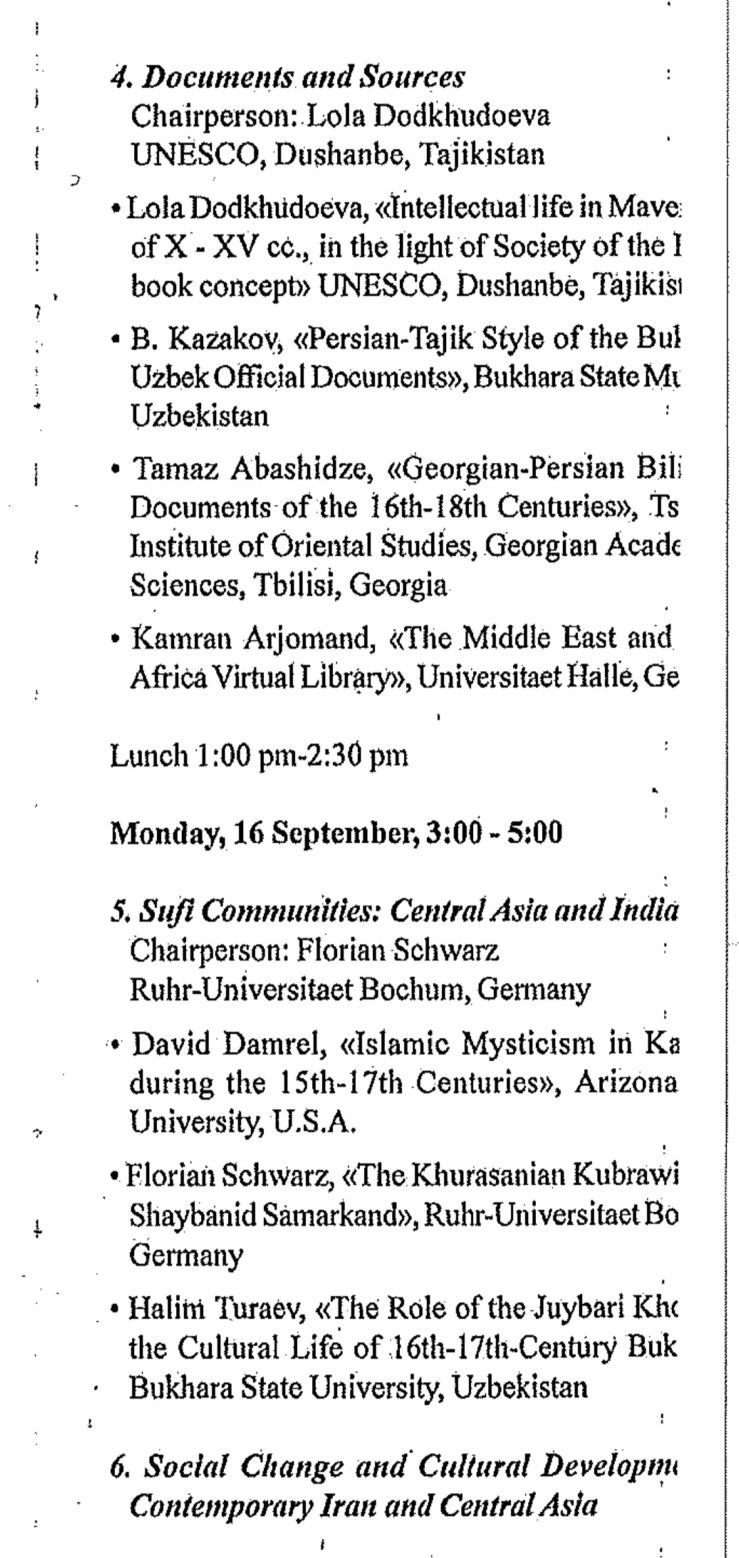 This conference was to be held with the cooperation of the Academy of Science of the Republic of Tajikistan, the Rudaki Institute of Language and Literature, and the National Commission ofUNESCO, Tajikistan. Over 60 participants from Armenia, China, India, Iran, Poland, Portugal, Russia, Tajikistan, and Uzbekistan ultimately presented papers covering a broad range of topics that included folklore and oral studies, pro-Islamic culture, literature, Sufism, social change and cultural development, economic history, historiography, modernity and its challenges, historical linguistics, and art and architecture.