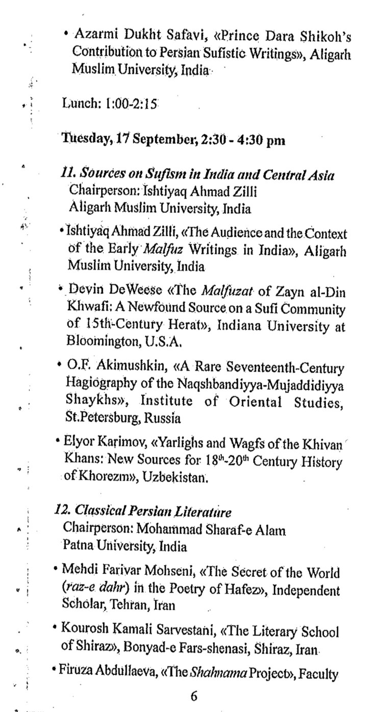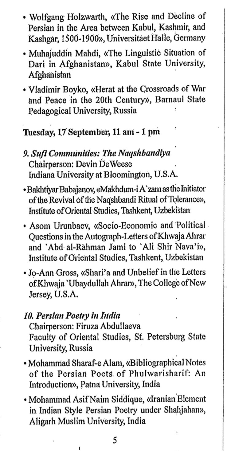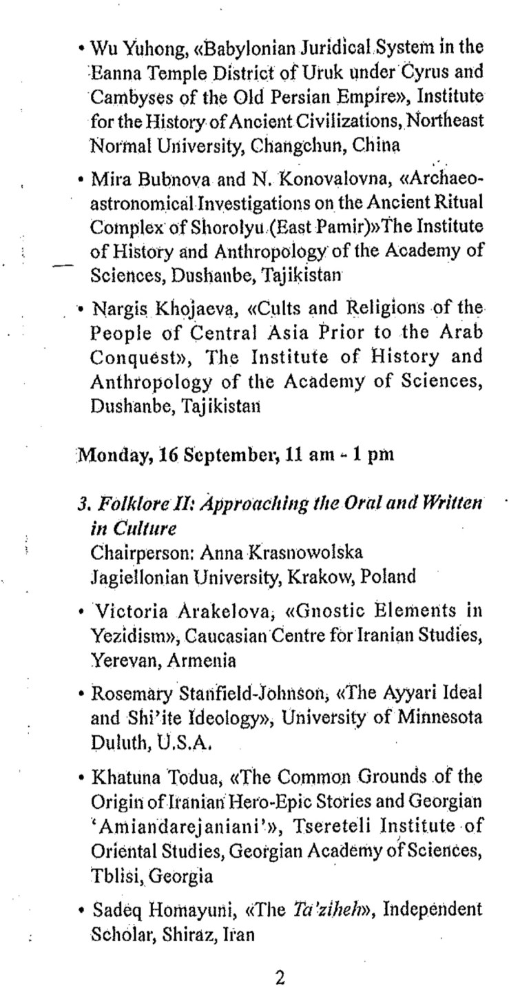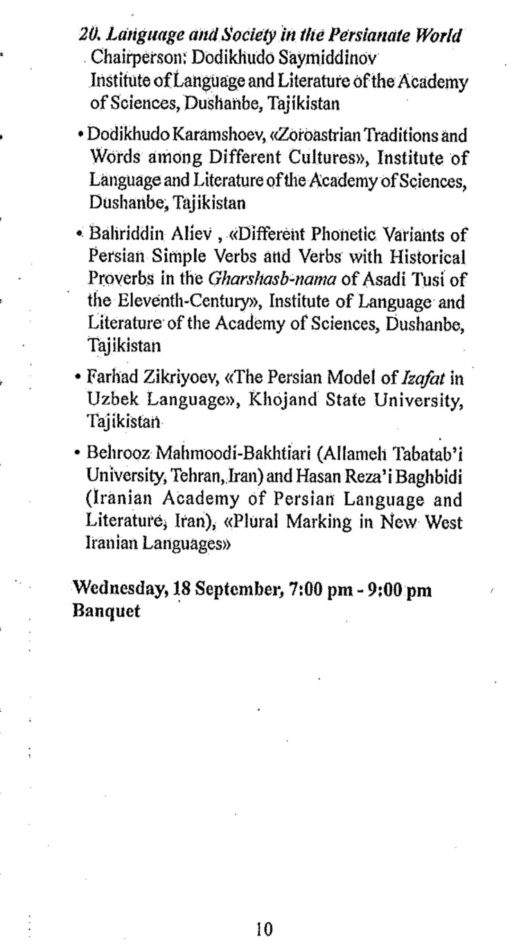 This conference was to be held with the cooperation of the Academy of Science of the Republic of Tajikistan, the Rudaki Institute of Language and Literature, and the National Commission ofUNESCO, Tajikistan. Over 60 participants from Armenia, China, India, Iran, Poland, Portugal, Russia, Tajikistan, and Uzbekistan ultimately presented papers covering a broad range of topics that included folklore and oral studies, pro-Islamic culture, literature, Sufism, social change and cultural development, economic history, historiography, modernity and its challenges, historical linguistics, and art and architecture.