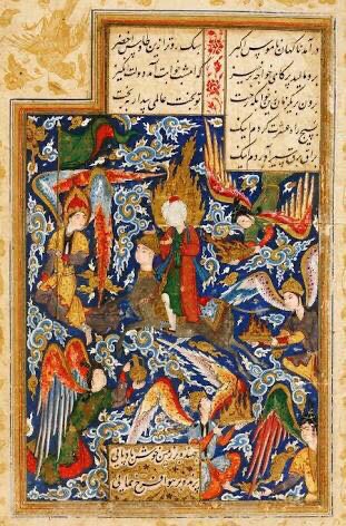 From the turn of the 14th century onward, depictions of the Prophet Moḥammad’s night journey (esrāʾ) and heavenly ascent (meʿrāj) were integrated into illustrated world histories and biographies, and also began to appear in animal fables like Kalila wa Dimna, compendia of poetical extracts, Persian romances, heroic tales, and divination books. Fully independent and lavishly illustrated Meʿrāj-nāmas (Books of Ascension) were produced from the time of Il-khanid rule (ca. 1260-1335) until the Qajar period (1794-1925) as well. As growing evidence indicates, it seems that these latter kinds of works were utilized for Sunni or Shiʿite missionary activities (see Gruber, 2005, 2008, 2009).