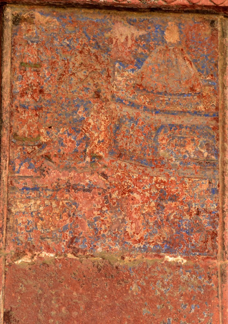 This panel depicts a temple complex with at least two pyramidal and a domed shikharas. What was the exact scene or it’s specific theme, it is not clear. But what is clear is that a temple was being drawn on the walls of a building which was under the direct use of Akbar!