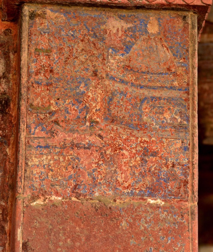 A very prominent Nāgara style shikhara temple is painted on one of the pillars of the eastern verandah of the Sunehra Makān, also popularly known as Mariyam’s House.