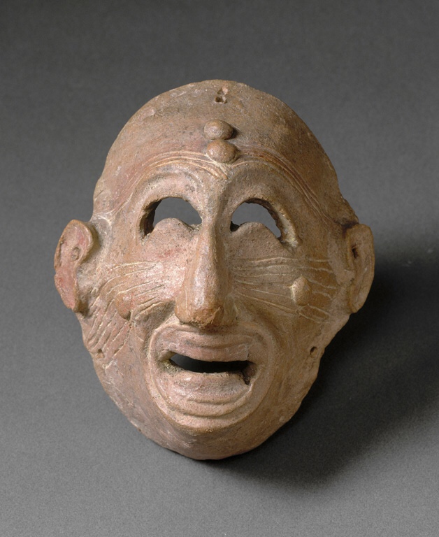 A fine example of a Carthaginian terra-cotta mask. In the late 9th century BC, the Phoenicians founded, in present-day Tunisia, a “new town” called Qart Hadasht, which the Romans corrupted to Carthage. This life-sized terra-cotta mask was discovered during 20th-century excavations of the necropolis. It depicts a grimacing figure with decorative discs on its forehead and cheeks. Lines are drawn to represent wrinkles. The term “mask” is used by archaeologists to refer to plastic representations of the face with openings for the eyes and usually for the mouth. These masks were common products made by Phoenician craftsmen. They were widely distributed in the Western world and are found in Greece, Cyprus, Sardinia, North Africa, and Spain.