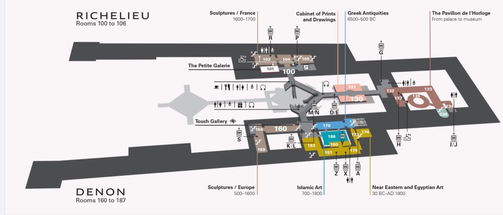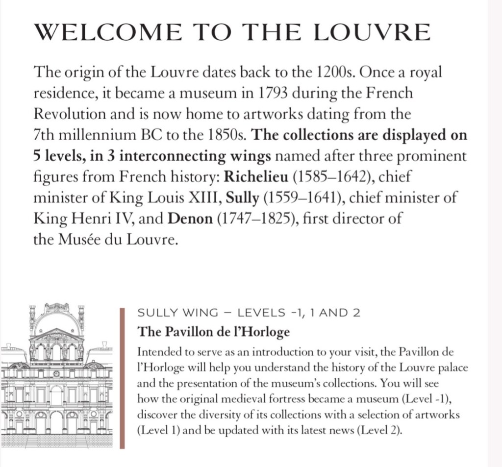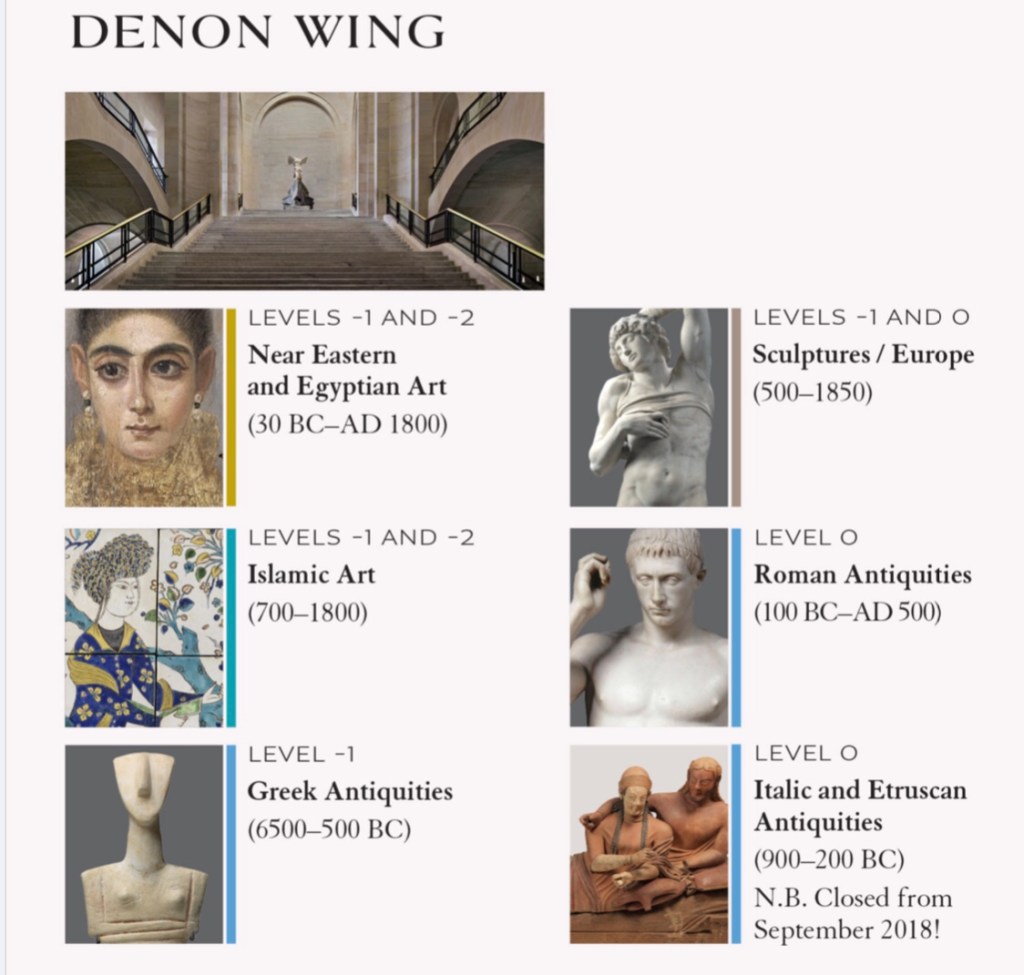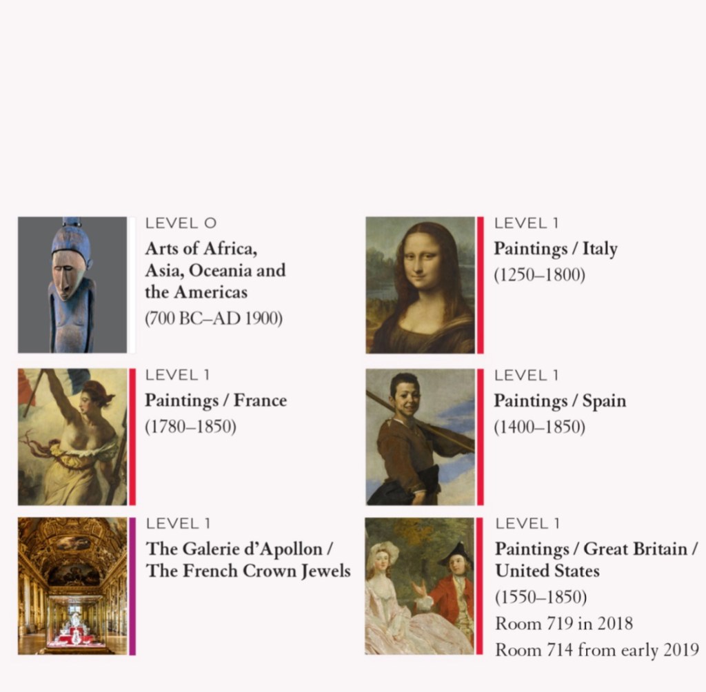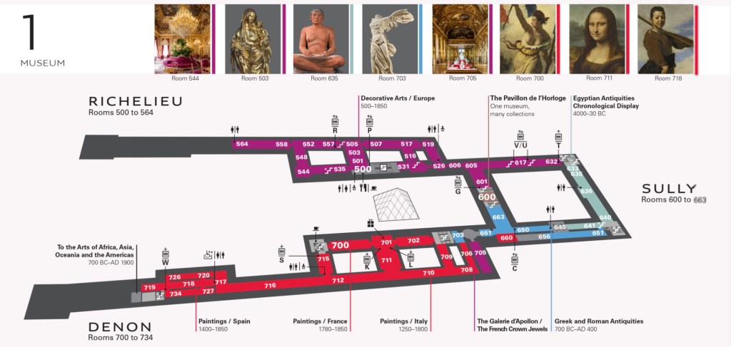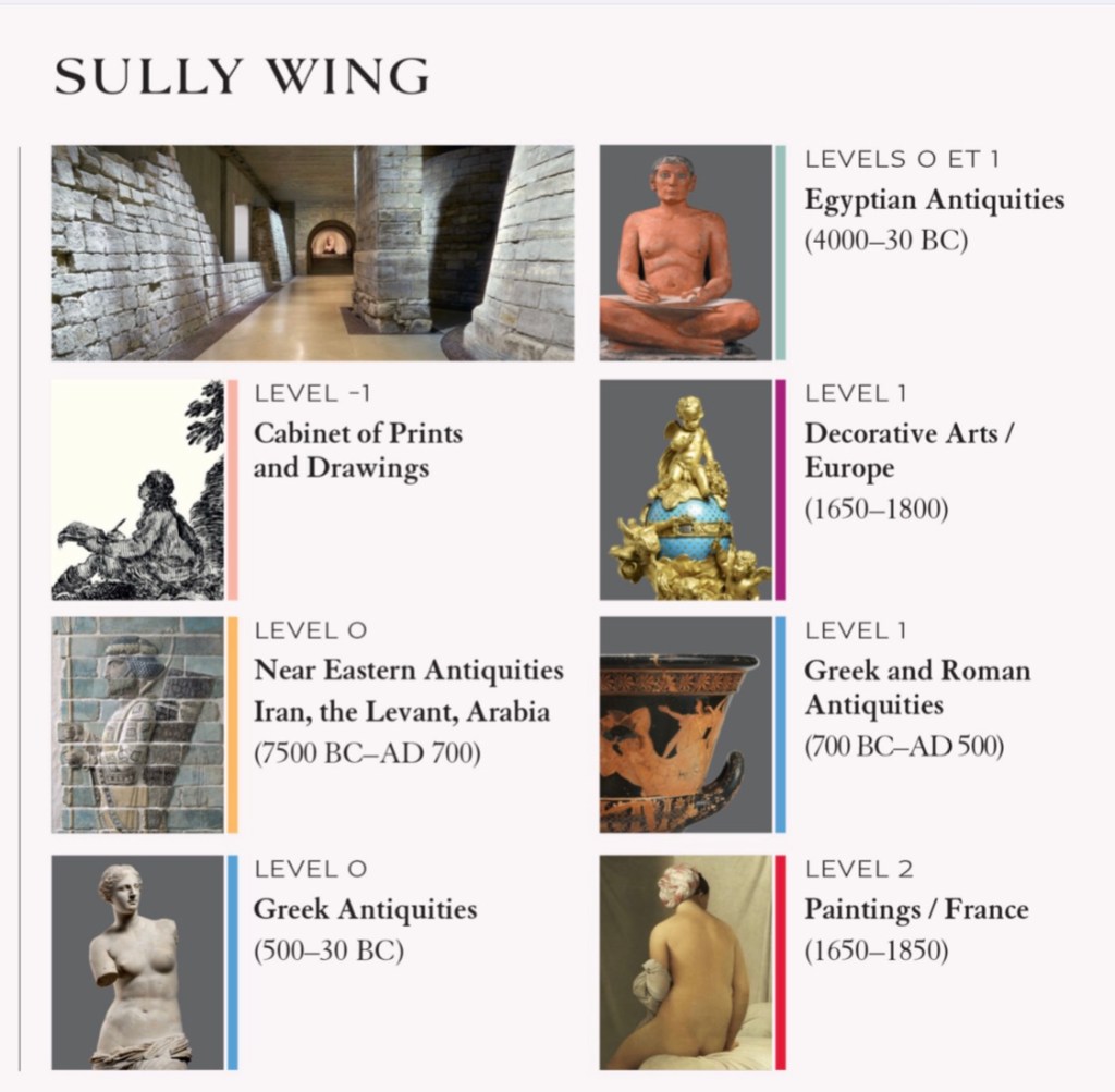 The whole Museum is divided into three wings and a Carousel: Richelieu, Sully and Denon spread on two floors: