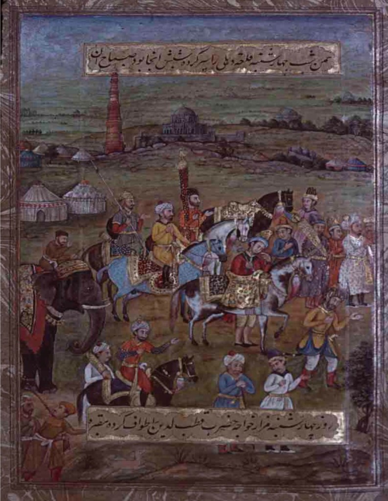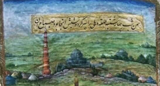 Also seen (perhaps again for the first and only time) in the miniature under discussion is the Qutb Minār built initially by Qutbuddin Aibek and then added upon by Sultan Iltutmish. The tapering minaret with its actual flutings and honeycomb balconies is depicted along with its original chhatri.