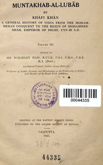 It is written by Muhammad Hashim whose title was Khafi Khan. It is a very important source of Aurangzeb’s period and covers aspects not found in other works easily. It can be compared to Barani and Abul Fazl.