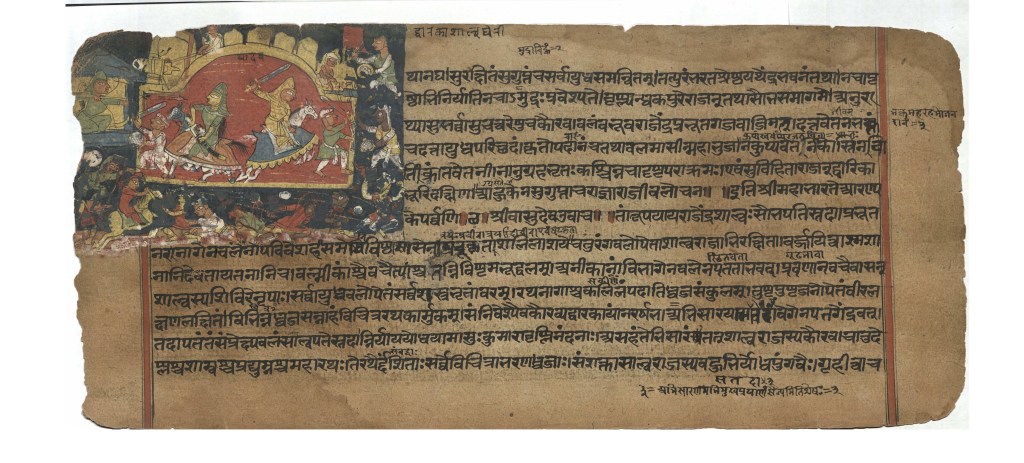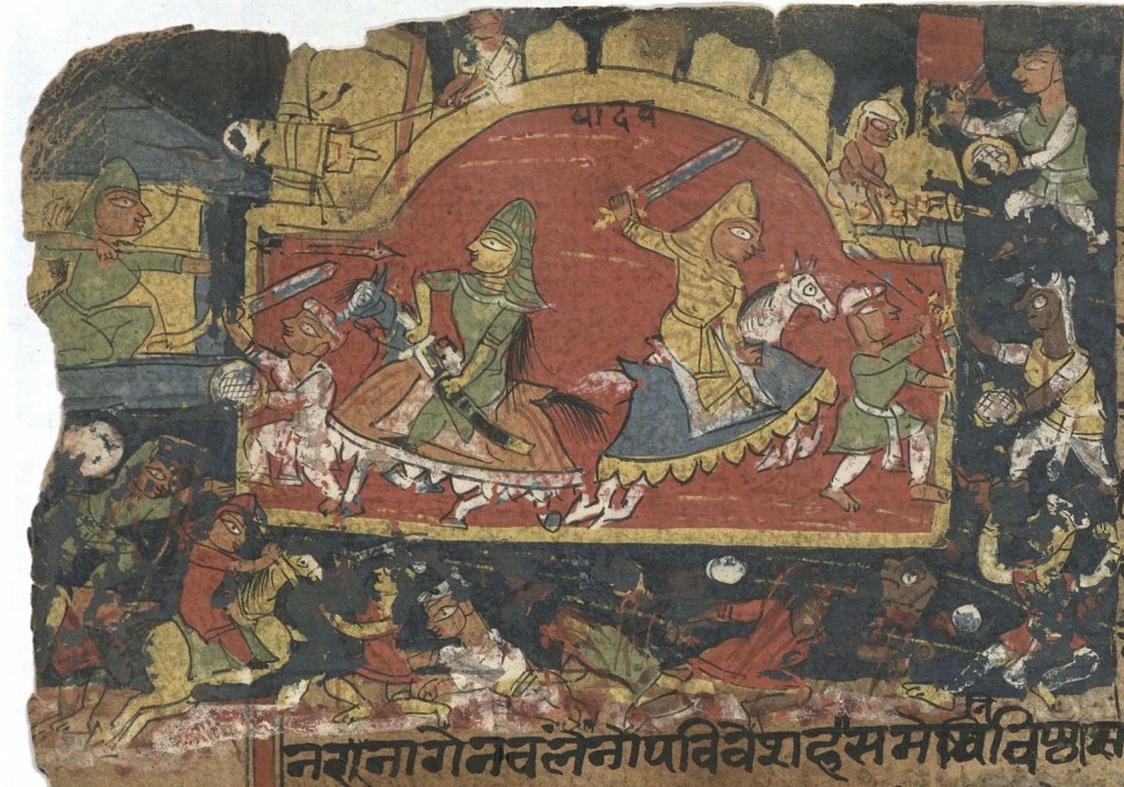 There is other information as well to indicate that the fire-arms were present in the land-locked states also. One of the most important source of this nature is an illustrated manuscript of Aranyak Parvan, a section of the Mahabharata, which was written and illustrated sometime during the reign of Sikandar Lodi, i.e., 1498-1516. It is preserved in the Asiatic Society at Bombay. In this ms, one illustration depicting the siege of Dwarka by Krishna are shown two small canons mounted on the ramparts. One of them is being fired by a man trying to hide behind the battlement.