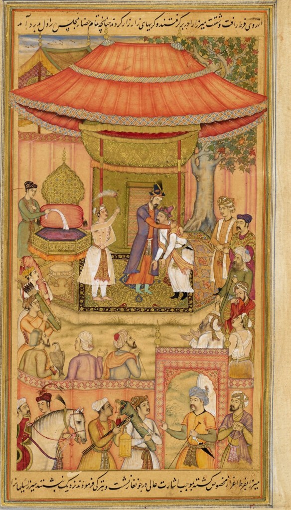 Mirza Kamran submits to Humayun. Akbarnama, artist Manohar, 1602-3, fol. 129r, British Library. Or.12988