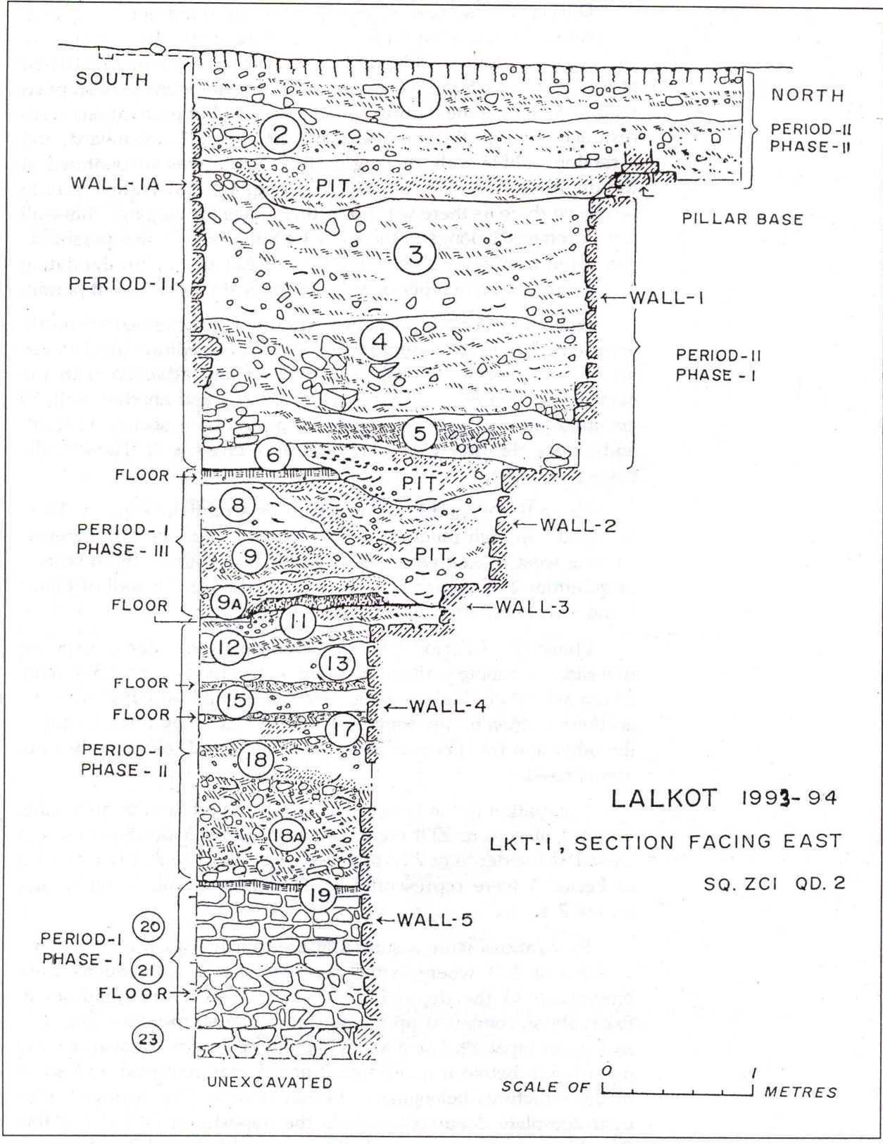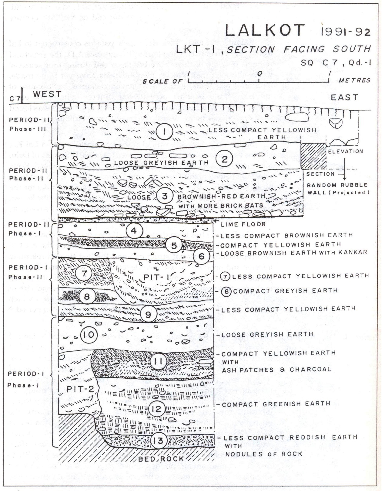 In this Period I one thus encounters either mud floors or mud floors mixed with lime finish. Two plastered drains were also noticed. At one spot remains of ochre painting were found over mud plaster on a wall. Ceramic industry included red ware, both plain and decorated. Black slipped grey ware were also encountered.