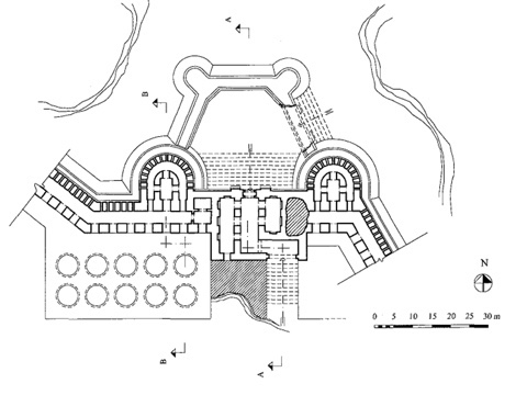 Typical of the period, the ramparts, the bastions and the gates are all tapering (i.e. cyclopean / battered) in form. The citadel is situated to the south of the town, on the highest point of the hill. It comprised private imperial structures, and thus it is here that we find a three-tiered defence system: (a) a sharply battered first tier with a 2m wide ledge protected with battlements (parapet with indentations), loopholes (slits in walls for firing guns), and merlons (crenellations, or solid wall between two openings); (b) a second wall 5 – 10 m high with a barrel-vaulted gallery; and then (c) on top of this arch-shaped battlements with loopholes.