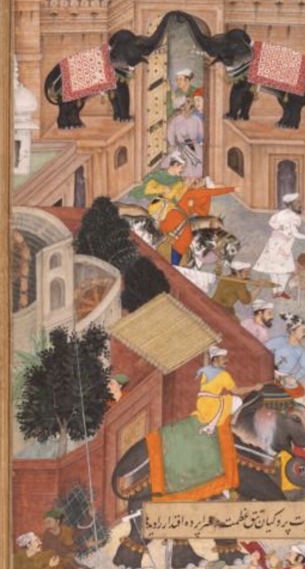 designed (or outlined; tarah) by Tulsi and painted ( amal ) by Bhawani, depicts a Persian wheel drawing water from a well near the Hathipol, which is under construction.