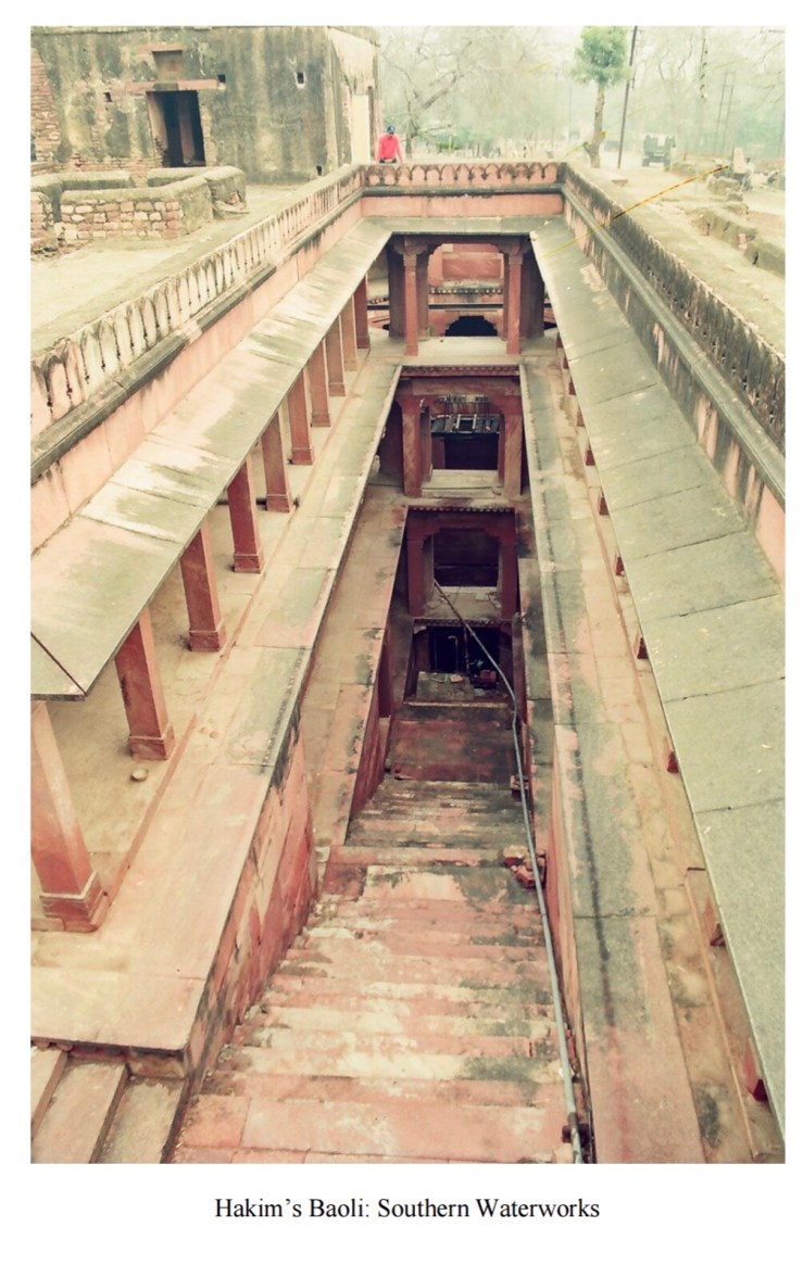 A closer took at the octagonal bāoli of the Northern water works and its storage wells reveals the provision of stone shafts which once held the vertically rotating wheel of pots. The draw-bars which rotated this wheel were placed in the two vaulted chambers, which we have noted flanked the well in the bāoli and the two storage wells. Similarly, protruding stone beams fixed atop the rectangular cavities near the Hathipol lifted the water atop the roof of the eastern quadrangle. Thus we see that the Northern waterworks was a complex of storage tanks, storage wells and Persian wheels which helped the water to be raised at five stages to reach the level of the Imperial complex atop the ridge.