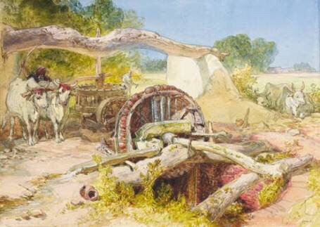 The Persian wheel, as we know, was a device which was based on the technique of pin-drum gearing. It comprised of a wheel, fixed on the mouth of the well, which contained a string of pots (māla). This wheel atop the well was connected with a second wheel through a shaft. The second wheel fitted with wooden pegs (pins) was rotated
